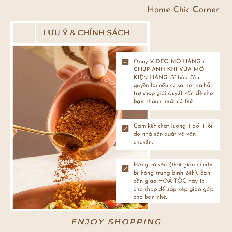 🌱 HOME CHIC chỉ ship COD đối với: Đơn hàng nội thành/đơn tỉnh dưới 1tr đồng và không có sản phẩm dễ vỡ. Đối với khách đặt hàng ship COD mà shipper giao tới khách từ chối nhận và giao không thành công, shop xin phép từ chối ship COD cho các lần sau.