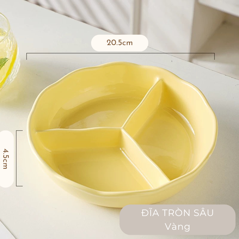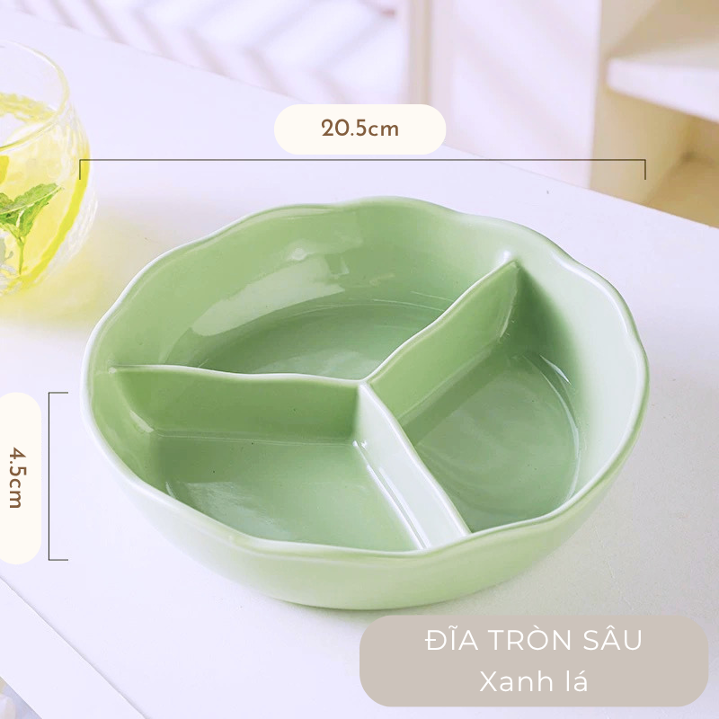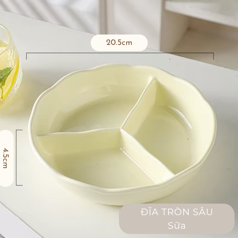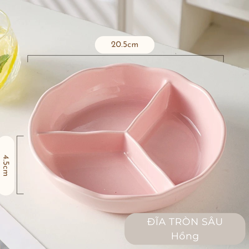 Đĩa sứ tròn chai ngăn đựng thức ăn màu pastel, đĩa ăn dặm cho bé men gốm cao cấp, đĩa chia định lượng thức ăn cho người giảm cân, đĩa ăn decor